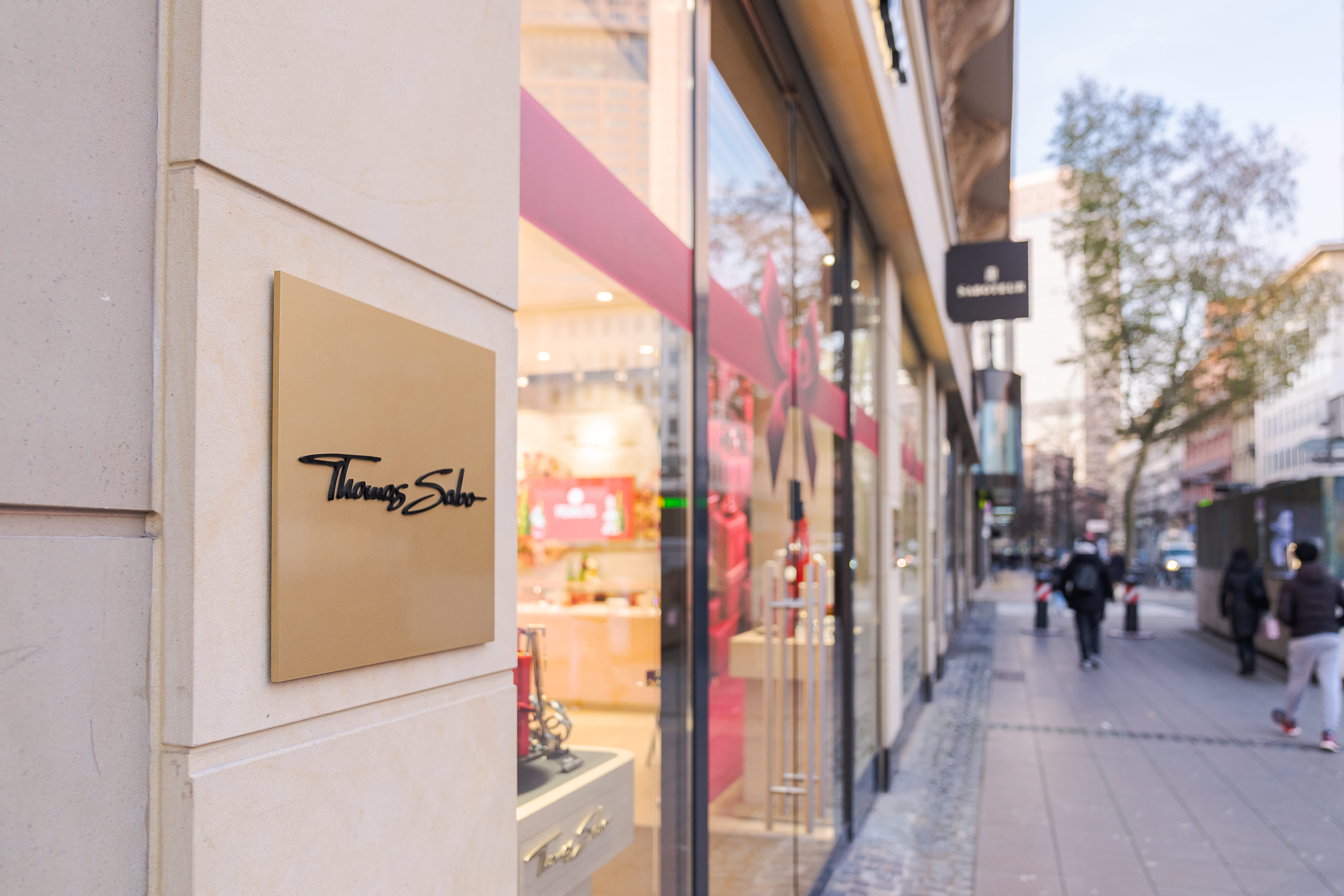 Thomas Sabo ist in Frankfurt vom Steinweg an den Roßmarkt umgezogen. Der neue Premiumstore bietet auf einer Fläche von rund 145 Quadratmeter ein stilvolles Ambiente. Freundliche, helle Farben, messingfarbene Akzente, edle Naturmaterialien wie Walnussholz sowie eine pastellfarbene Blumenwand verleihen dem Store eine exklusive Optik. Die weichen, abgerundeten Möbelformen unterstreichen die edle Ladengestaltung. Im Store verteilte, dezente Bildschirme heben mit Videos die Kollektionen hervor.