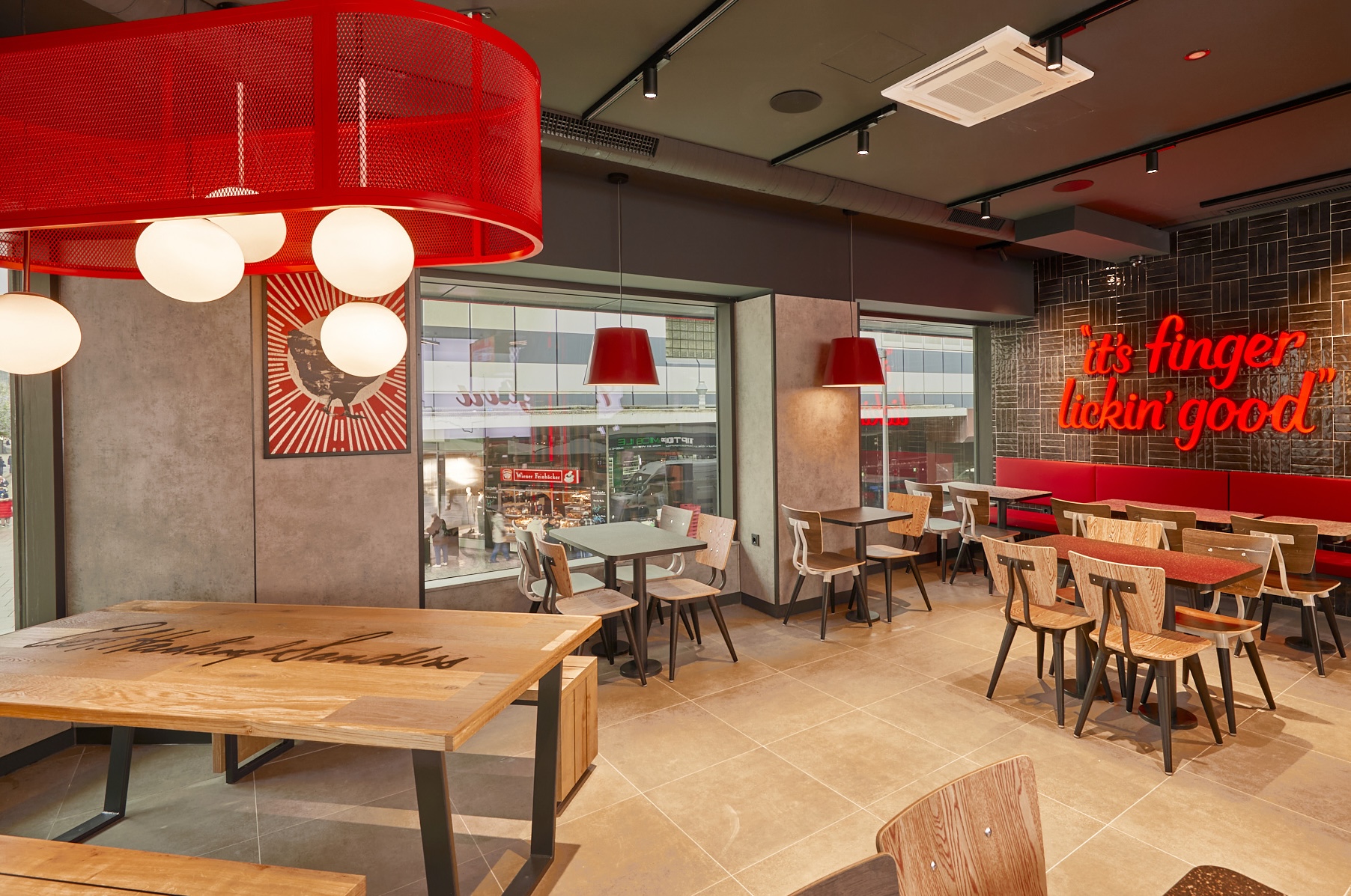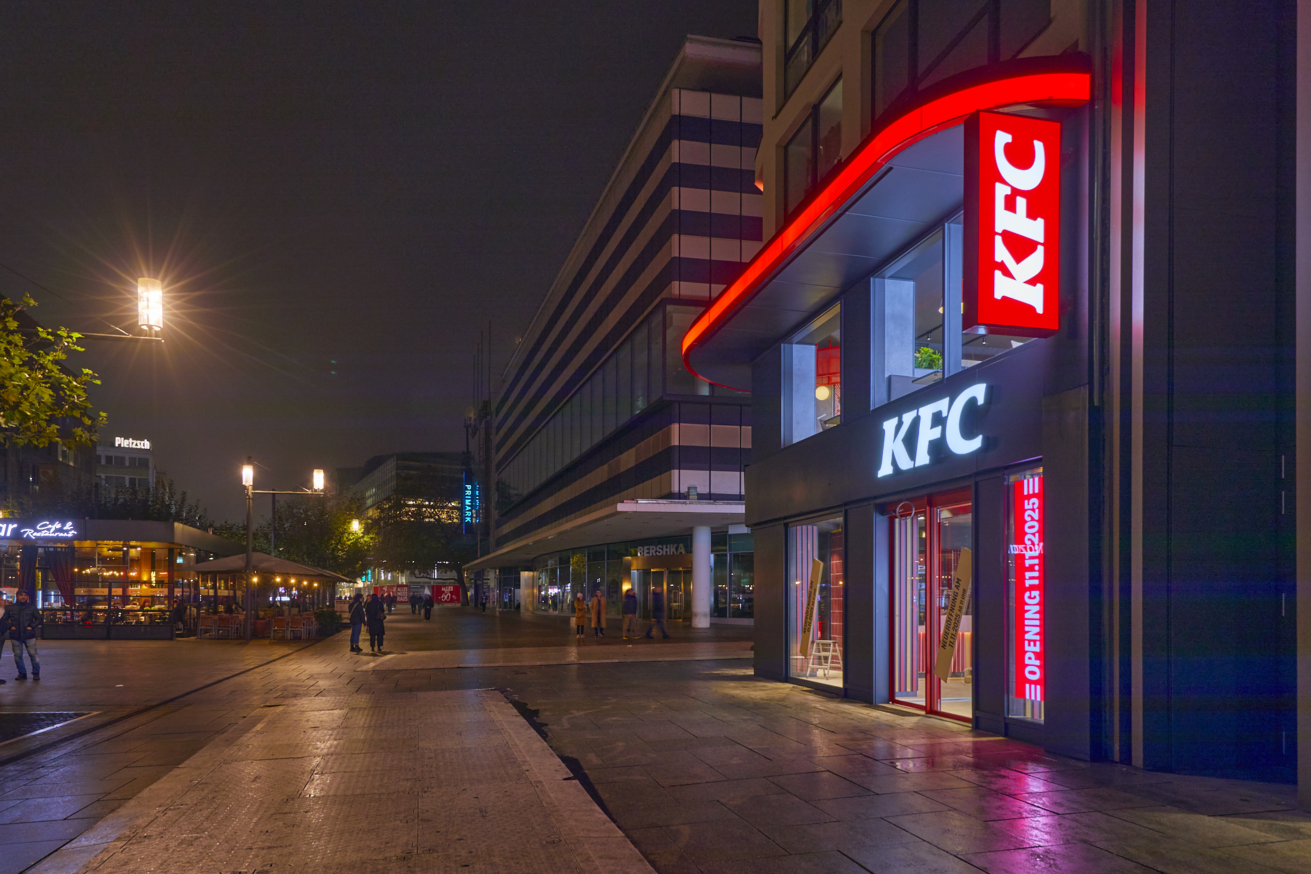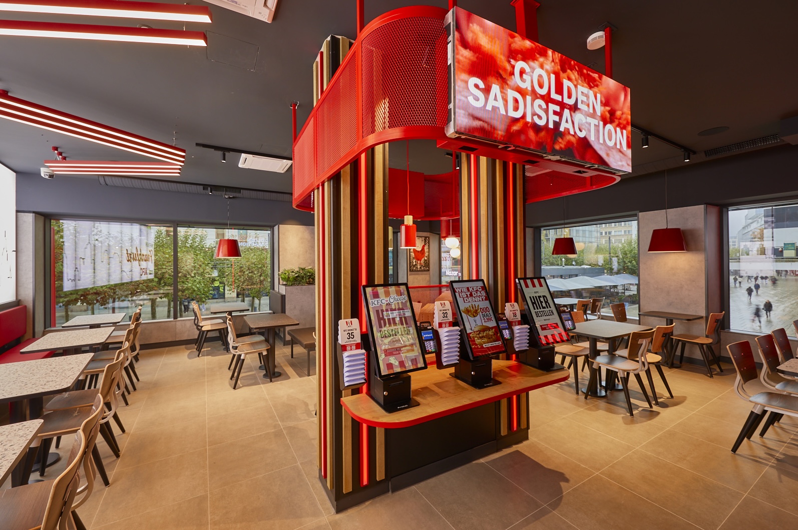 KFC hat mit einem in Deutschland bis dato einmaligem Core-Plus-Storekonzept mitten im Herzen Frankfurts auf der Zeil ein neues Restaurant eröffnet. Das neue Lokal der amerikanischen Fast-Food-Kette erstreckt sich über zwei Etagen und bietet rund 68 Sitzplätze im Innenbereich. Es zeichnet sich durch innovative Technologien, Services und Produkte aus. Gäste bestellen an modernen Self-Order-Kiosken und wählen, ob sie ihre Bestellung am Counter abholen oder den Table Service nutzen möchten. Das markante Interior Design mit lokalem Bezug soll mit den großen LED-Flächen die Dynamik Frankfurts und die Energie der Marke KFC widerspiegeln.