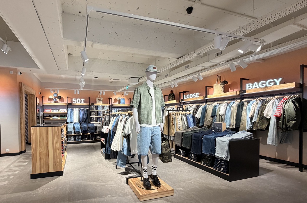 Der lichtdurchflutete Store präsentiert das gesamte Denim-Lifestyle-Portfolio von Levi’s. Hochwertige natürliche Materialien, sorgfältig ausgewählte Oberflächen und industrielle Designelemente prägen das Store-Konzept, das durch ombréfarbene Akzente ergänzt wird. Großzügig gestaltete Umkleidekabinen sorgen für ein komfortables Einkaufserlebnis. Der Store bietet eine kuratierte Auswahl an Levi’s Denim- und Lifestyle-Produkten, darunter auch Styles aus der aktuellen Zusammenarbeit mit Model und Unternehmerin Stefanie Giesinger.