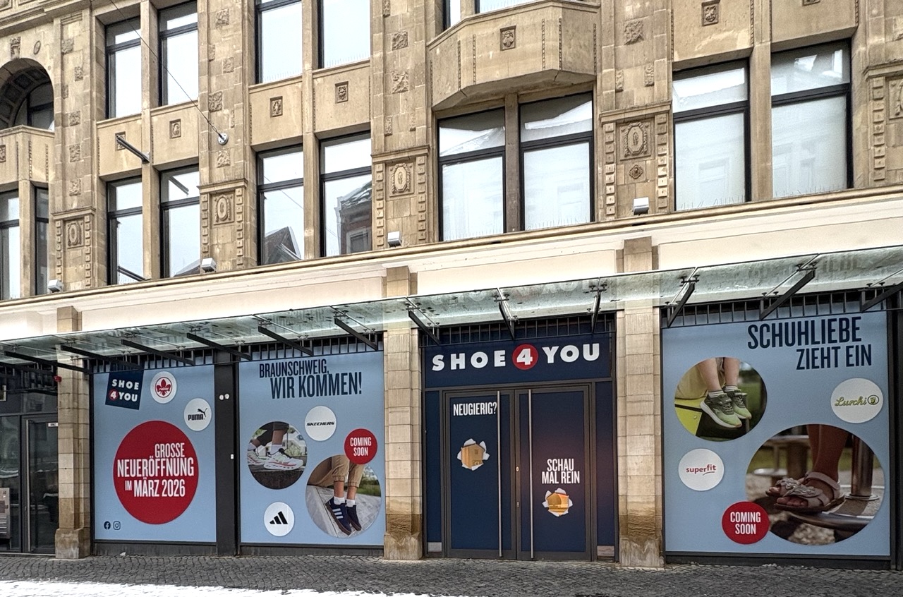 Shoe4You eröffnet am 5. März 2026 einen neuen Flagshipstore in Braunschweig am Damm 40. Damit setzt das Filialkonzept der Kienast-Gruppe seinen Expansionskurs der vergangenen Monate weiter fort. In den letzten 18 Monaten hat Shoe4You bereits 15 neue Stores eröffnet. Der Schuhhändler baut seine Präsenz damit auf deutschlandweit insgesamt 70 Filialen aus. Der neue Store in der Braunschweiger 1A-Lage hat eine Verkaufsfläche von über 900 Quadratmetern und verläuft über zwei Etagen. Vormieter am Standort war Depot.